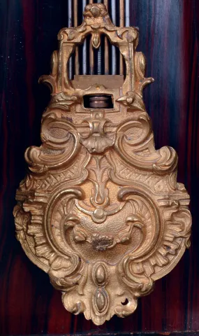 It appears to us that the French cast pendulum has been adapted to the case, and although it looks attractive, the clock started life with a wooden rod and brass bob. To bring the dial closer to the glass, cardstock shims have been added under the mounting bracket. The well made movement has Harrison style retaining power. 2 small trim moldings lacking at top. No winding crank. Delicate hands are original. Ht 32"