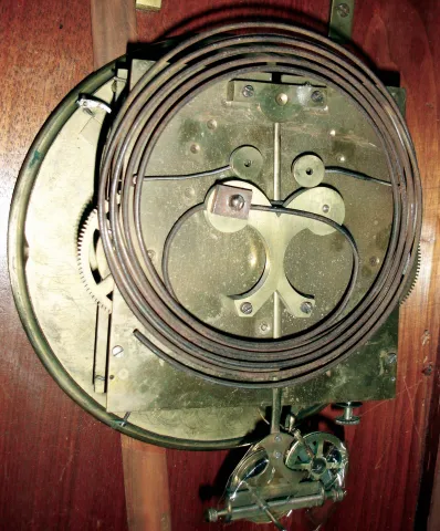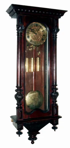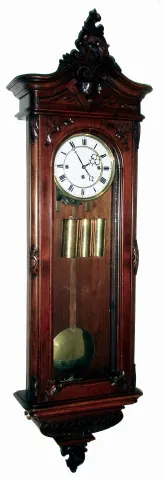 Clocks- 2 (Two) German walnut 3 weight, 8 days, walnut Vienna regulator wall clocks, c1890 except for a missing top crest, the clocks appear complete and with old surfaces. The movements are unsigned. The ornate pendulum one has matching weights. Sold as is, no further details available. Hts 50" & 42"