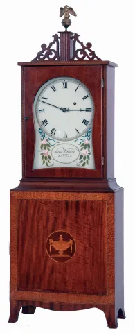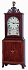 this well-made, handsome case is an earlier reproduction of the Willard classic design, with an elegant inlaid urn, and remains in very good condition with no losses or damage. The signed painted metal dial is nice, with a little cracking around the posts. The movement has some age. It ticks but was not tested long term; the weight is the correct size and style. Measures 38" x 13" x 5 3/4"