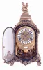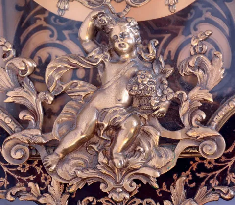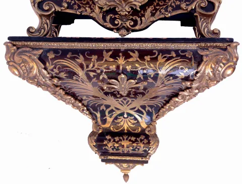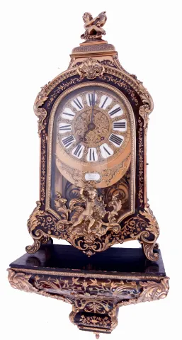 Bracket clock in the Louis XV style, boulle work case mounted with cast ornaments in the rococo style, the top with lyre playing putto, interior of the case also with boulle work, with its original, boulle work wall bracket, brass dial with Roman numeral