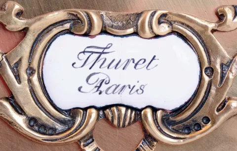 Bracket clock in the Louis XV style, boulle work case mounted with cast ornaments in the rococo style, the top with lyre playing putto, interior of the case also with boulle work, with its original, boulle work wall bracket, brass dial with Roman numeral cartouches and blued steel hands, signed "Thuret a Paris", 8 days, time and strike, spring driven movement with Brocot escapement, the back plate marked "Roblin & Fils Freres a Paris", c1870 case with losses to brass inlay and tortoise shell, also with restoration, dial good, signature cartouche with hairline, hands with minor oxidation, movement ticks and strikes, 26" h x 12 1/2" w