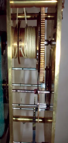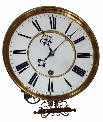probably 30 day duration (winding left), this large long hanging clock has an old finish, but needs some minor restoration. The white porcelain dial i...