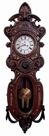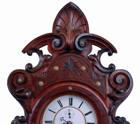 German, 2-weight "Vienna" style wall clock, in an unusual alt Deutsch case with carvings and brass appliquEs., serial #293731, c1875, with restorations.