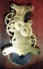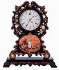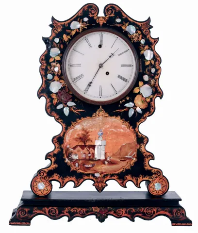 Litchfield Mfg. Co., Litchfield, Conn., 8 days, spring driven brass movement timepiece in impressive decorated MOP paper mache case, c1852 Paper mache case richly painted and with MOP inlay in nice condition, with some issues that will attention. The left rear foot is cracked in a couple of places and will need repair. The curved piece on the upper left side at about 10 o'clock has been poorly repaired and needs correction. The round molded edge on the base has some roughness in the center. Original painted dial has minor loss at mounting screws and minor wear to numerals. Original hands. The unusual double escapement movement by Mathews, Jewell & Co., of Bristol. Samuel Botsford probably designed the movement as he was a partner in that firm. There is history of the ownership of the clock. Despite the repair issues this is a rare clock. Ht 26"