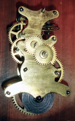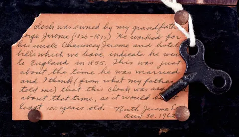 Paper mache case richly painted and with MOP inlay in nice condition, with some issues that will attention. The left rear foot is cracked in a couple of places and will need repair. The curved piece on the upper left side at about 10 o'clock has been poorly repaired and needs correction. The round molded edge on the base has some roughness in the center. Original painted dial has minor loss at mounting screws and minor wear to numerals. Original hands. The unusual double escapement movement by Mathews, Jewell & Co., of Bristol. Samuel Botsford probably designed the movement as he was a partner in that firm. There is history of the ownership of the clock. Despite the repair issues this is a rare clock. Ht 26"