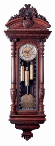 Vienna Regulator, Grande Sonnerie wall clock, 8 days, three weight driven movement in an Alt Deutsche style carved walnut case with engraved dial center, pendulum bob and brass weights, c1875 the case retains its original finish. The crest has an old repair in the right corner. There is acid etched decoration around perimeter of door glass. The back tail of the minute hand is broken. The chapter ring has slipped to the left on the dial plate in the photo, but easily corrected. Ht 55"