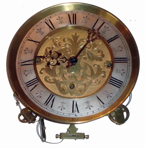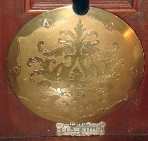 the case retains its original finish. The crest has an old repair in the right corner. There is acid etched decoration around perimeter of door glass. The back tail of the minute hand is broken. The chapter ring has slipped to the left on the dial plate in the photo, but easily corrected. Ht 55"