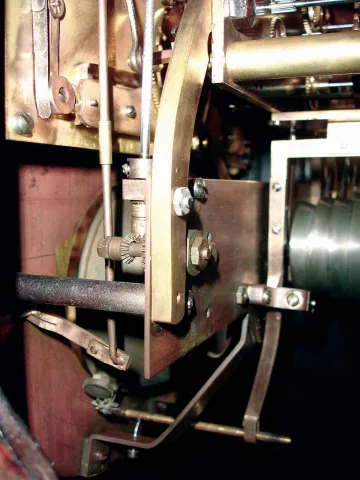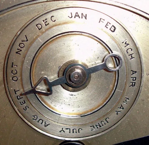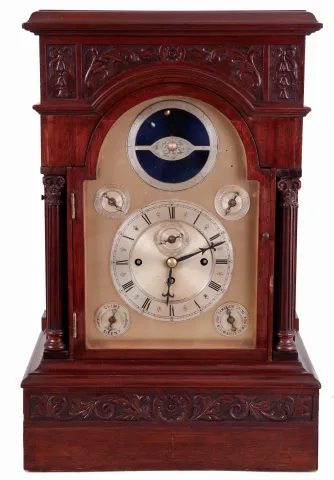 English, rare tellurium chiming clock movement with vertical orrery, NOW ASSOCIATED with a modified mahogany case, the three train movement with calendar indications, months above center shaft, days of the week to the left, and date to the right, c1890.