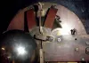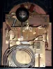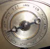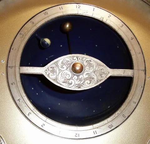 English, rare tellurium chiming clock movement with vertical orrery, NOW ASSOCIATED with a modified mahogany case, the three train movement with calendar indications, months above center shaft, days of the week to the left, and date to the right, c1890. not for the meek. Someone found a case with the correct dial opening and then added two inches to the depth and 3 inches to the height in order to accommodate the large and complex movement. The movement has been cleaned; it now has brass cable in lieu of chains. Chimes on your choice of Westminster tune on gongs or Cambridge chime on 8 bells. The hour is struck on a deep toned cathedral gong. The movement runs and chimes, The planetary assembly will need adjustment. Very heavy. Ht 27"
