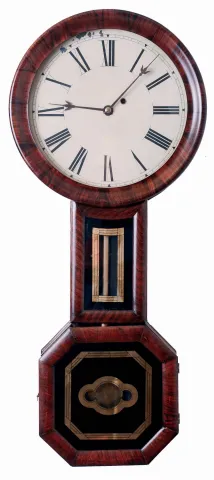Baltimore" style banjo wall clock, 8 days, time only, weight driven movement in a rosewood grain painted case with painted metal dial and reverse painted throat and lower tablets, c1860