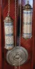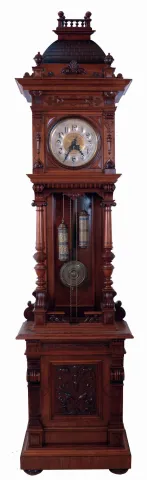 RSM, Germany, open well tall clock, 8 days, time and strike, brass weight driven movement in a well carved walnut case with columns supporting hood, bun feet, matching pendulum and weight decoration, silvered brass dial, c1910 the clock is in excellent original condiiton. One of the weight shells needs a weight insert and the gong needs to be reattached. Both sides of the hood have some worm holes. Floor standing open wells of ths caliber do not turn up that often. This clock is from the Holt collection in Oregon. Lots of "look" Ht 94 1/2", Width 25 1/2", Depth 13 1/2"