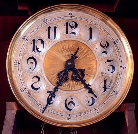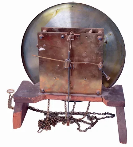 the clock is in excellent original condiiton. One of the weight shells needs a weight insert and the gong needs to be reattached. Both sides of the hood have some worm holes. Floor standing open wells of ths caliber do not turn up that often. This clock is from the Holt collection in Oregon. Lots of "look" Ht 94 1/2", Width 25 1/2", Depth 13 1/2"