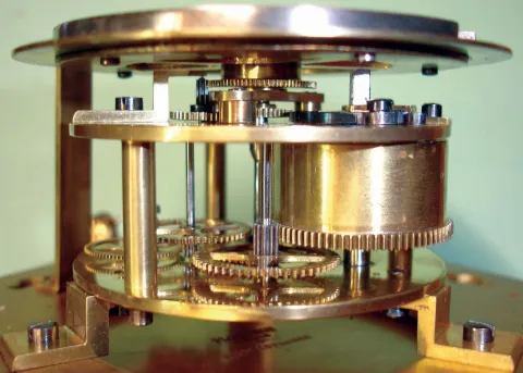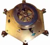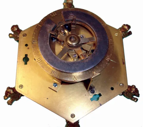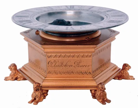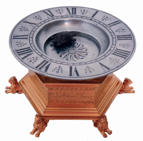 Planchon, a Paris, turtle mystery clock of small size, the molded hexagonal, gilt bronze base with decorative engraving resting on recumbent lion form feet, supporting a pewter basin with Roman numeral chapter engraved around rim, the turtle floating in the basin and indicating the time, given motion by a magnet driven by the 8 day timepiece movement with lever platform, concealed in the base. Case bears the initials E. M., probably for Etienne Maxant, manufacturer of high quality bronze clocks, often copying earlier styles, c1890 case good with minor dirt, basin with minor marks and scratches, turtle replaced, movement clean and running, Ht 3 3/4"