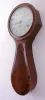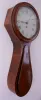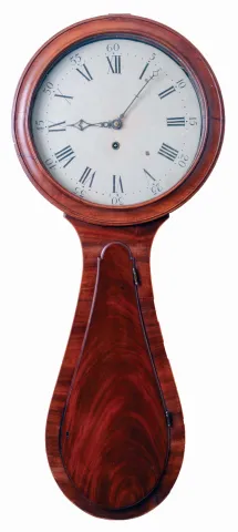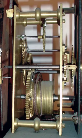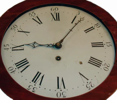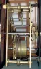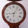 the case retains an old finish. The inlay at base of clock is absent and has been filled. There are several veneer and other repairs on lower case. There is a solder repair on suspension. Ht 43"