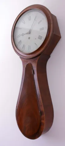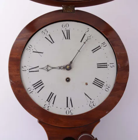 English tavern wall clock, 8 days, time only weight driven movement in a mahogany and crotch mahogany veneer case with string inlay with a painted iron dial, c1830 the case retains an old finish. The inlay at base of clock is absent and has been filled. There are several veneer and other repairs on lower case. There is a solder repair on suspension. Ht 43"