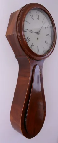 English tavern wall clock, 8 days, time only weight driven movement in a mahogany and crotch mahogany veneer case with string inlay with a painted iron dial, c1830
