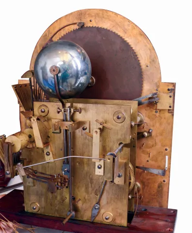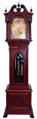 John J. Elliott, London, England (attribution) for Simons Bros. Co., Philadelphia, Penn., tall clock, time, strike and Westminster and Whittington chime on 8 bells and four gongs, 8 days, three brass weight driven movement in a mahogany case with full