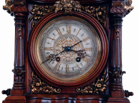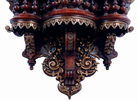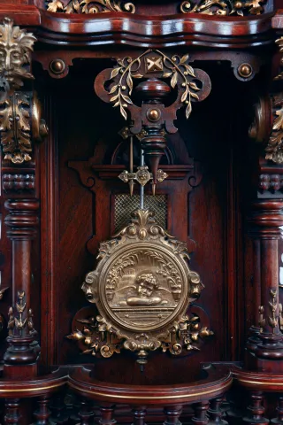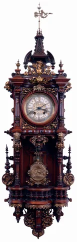 Lenzkirch, Germany, model 676 "The Little Mermaid", walnut wall clock with profuse bronze decorations, 8 days, time and gong strike, serial #1Million, 219,792, c1899