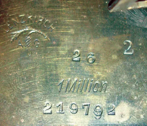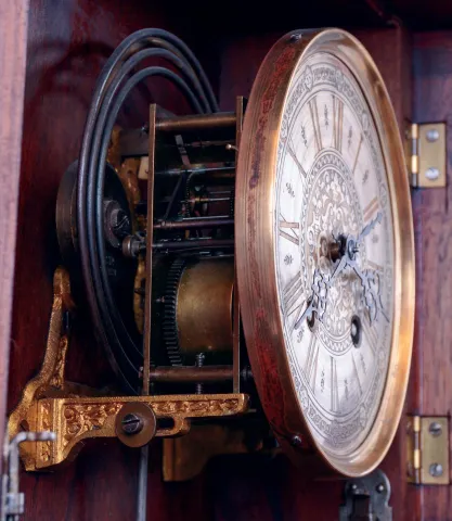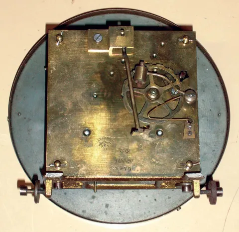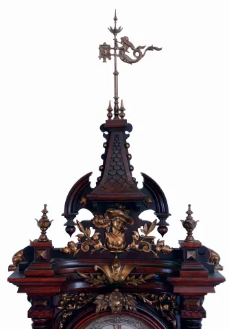 excellent original condition; case and movement uncleaned; excellent satin patina on original finish. Details on this clock can be found in "Lenzkirch Clocks, the Unsigned Story", pages 214 and 110. The nick-name for the clock comes from the little mermaid on the weather-vane at top. George Everett writes that "this is one of the most ornate Lenzkirch models made". The movement with good trademark and well impinged serial #. Original pendulum, stabilizers, dial, hands, bracket and trim. The only minor shortcoming, and this is minor, is that the black wax has fallen out of the engraved dial numerals, and the numerals appear as a gold tone, rather than as black. Probably best to leave it as is; the black can be added at any time. Ht 43", 110cm.