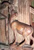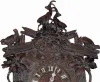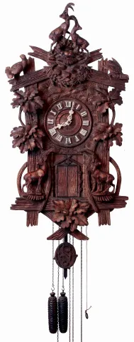 German, Black Forest, 8-note flute clock, this wall hanger profusely carved with Alpine Ibex {family of 3 at apex, and two adults lower], also oak leaves and acorns and the top rail with a quail on each side, 3-weight, one day, time, strike and music, as