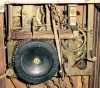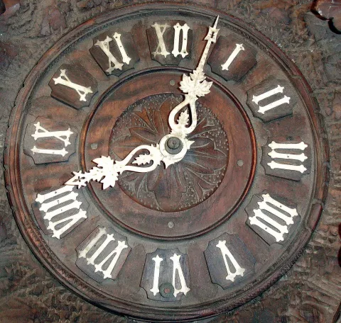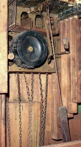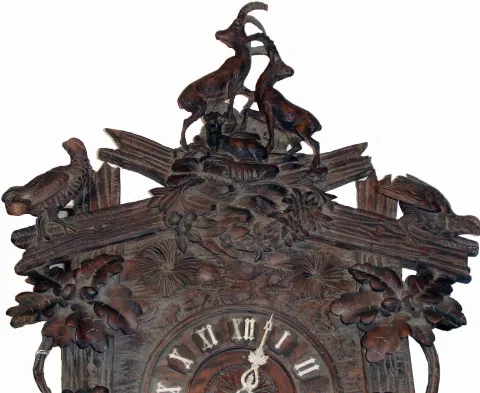 German, Black Forest, 8-note flute clock, this wall hanger profusely carved with Alpine Ibex {family of 3 at apex, and two adults lower], also oak leaves and acorns and the top rail with a quail on each side, 3-weight, one day, time, strike and music, as-found from a barn, Clock dates c1890 the flautist is intact behind the lower doors, all 8 flutes are present; bellows are there but will need re-covering. Original wooden pendulum intact. The rear dust cover and its' gong and the large weight for the flute train are missing. The pin-drum and all linkages are intact. There are minor tips missing from flowers, quail beaks missing, etc, but nothing major; plenty fly specs and dirt. Original hand carved hands are intact. Numerals were replaced long ago and will need attention. Heavy brass plate movement is about 8 inches square. Pendulum is 29" Overall height 39"