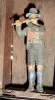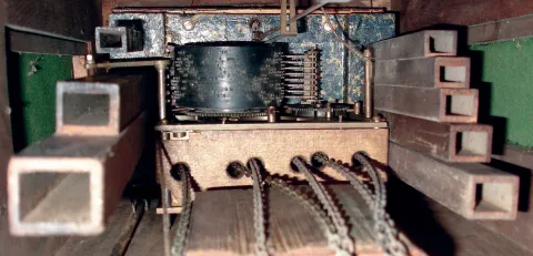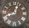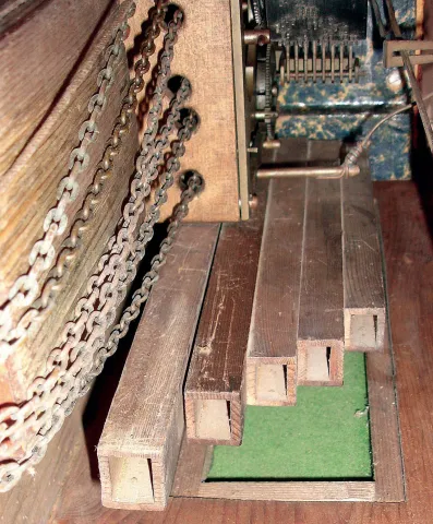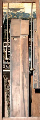 the flautist is intact behind the lower doors, all 8 flutes are present; bellows are there but will need re-covering. Original wooden pendulum intact. The rear dust cover and its' gong and the large weight for the flute train are missing. The pin-drum and all linkages are intact. There are minor tips missing from flowers, quail beaks missing, etc, but nothing major; plenty fly specs and dirt. Original hand carved hands are intact. Numerals were replaced long ago and will need attention. Heavy brass plate movement is about 8 inches square. Pendulum is 29" Overall height 39"