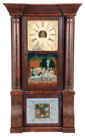Clocks- 2 (Two): (1) Birge, Peck & Co., Bristol, Conn., cornice and column shelf clock with a weight driven 8 days time and strike movement in a mahogany veneered case. c1850. (2) Welch, Spring & Co., Forestville, Conn., "Cary VP", 8 days, time and strike