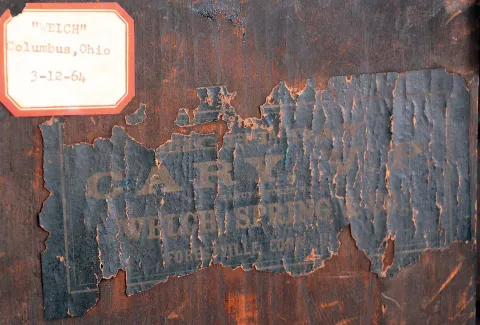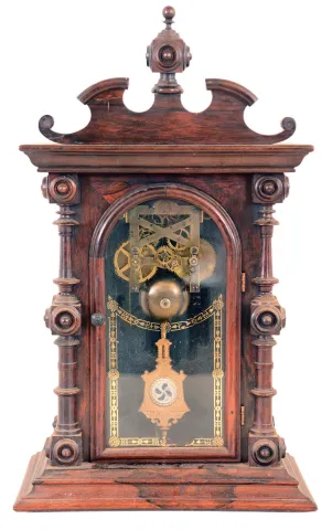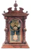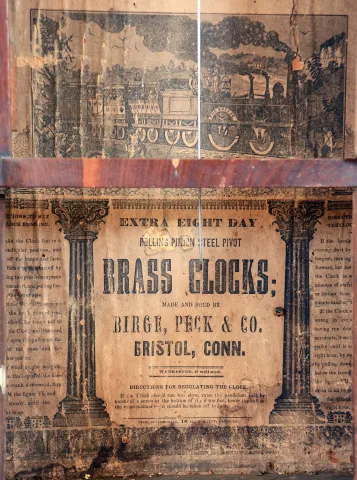 Clocks- 2 (Two): (1) Birge, Peck & Co., Bristol, Conn., cornice and column shelf clock with a weight driven 8 days time and strike movement in a mahogany veneered case. c1850. (2) Welch, Spring & Co., Forestville, Conn., "Cary VP", 8 days, time and strike spring brass movement shelf clock. c1880. (1) The case retains it original finish and has some veneer damage along the base. The original painted dial has significant loss at 7:00. The hands are original. The Ives-type strap brass movement is unsigned. All three door glasses are original, but the center glass is cracked. The lower glass is like a Fenn glass. The weights are absent. Ht. 32.25". (2) Rosewood and rosewood veneered case in original finish. The case is in need of restoration - needing a dial, the various round turnings on the crest. Original tablet with minor loss and original pendulum. Partial label on the back of the case. Ht. 20".