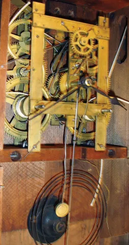 (1) The case retains it original finish and has some veneer damage along the base. The original painted dial has significant loss at 7:00. The hands are original. The Ives-type strap brass movement is unsigned. All three door glasses are original, but the center glass is cracked. The lower glass is like a Fenn glass. The weights are absent. Ht. 32.25". (2) Rosewood and rosewood veneered case in original finish. The case is in need of restoration - needing a dial, the various round turnings on the crest. Original tablet with minor loss and original pendulum. Partial label on the back of the case. Ht. 20".
