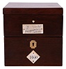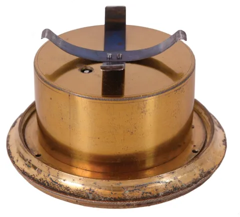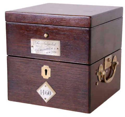 movement with minor scratches and minor, scattered spotting, running well, dial with a few minor spots, minor scratches and a bit dirty, hands good, tub and gimbal with old lacquer, scratches and minor discoloration, shock mount in old lacquer, box refinished, top with split, hinges polished minor loss to infill on Heinrich plaque, key holder replaced, key good. A very nice, early example of this well known firm's work.