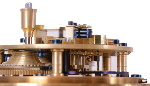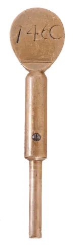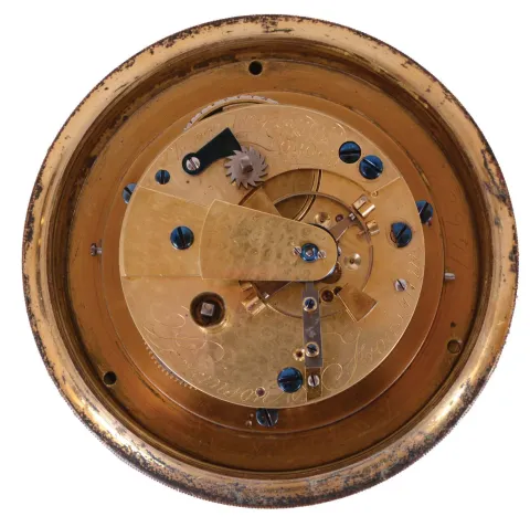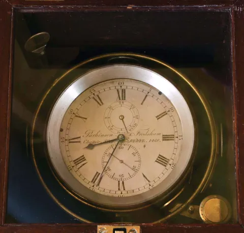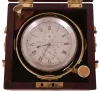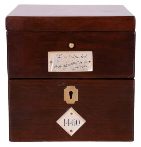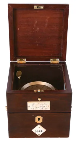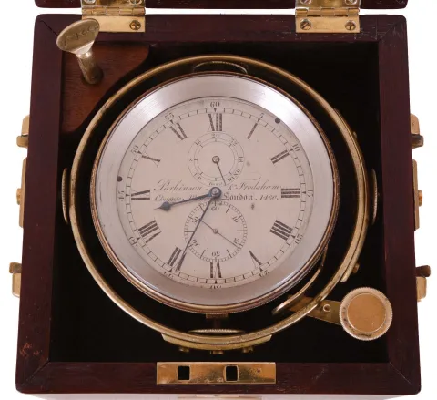Parkinson & Frodsham, Change Alley, London, 2 day marine chronometer, small gilt plate fusee movement with spotting, spring detent escapement, and chronometer balance with blued steel helical hairspring, silvered Roman numeral dial with wind indicator, blued steel spade and poker hands, screw bezel with flat beveled glass, lacquered brass tub in gimbals, with inner shock proof tub containing movement, all in a mahogany box with brass hardware, the front with mother of pearl plaques, one marked "Re Adjusted by H. H. Heinrich New York", the other with the chronometer number "1460",with original numbered winding key, 6 1/2" x 6 1/2" x 6 1/2", c 1825 movement with minor scratches and minor, scattered spotting, running well, dial with a few minor spots, minor scratches and a bit dirty, hands good, tub and gimbal with old lacquer, scratches and minor discoloration, shock mount in old lacquer, box refinished, top with split, hinges polished minor loss to infill on Heinrich plaque, key holder replaced, key good. A very nice, early example of this well known firm's work.