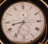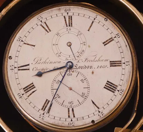Parkinson & Frodsham, Change Alley, London, 2 day marine chronometer, small gilt plate fusee movement with spotting, spring detent escapement, and chronometer balance with blued steel helical hairspring, silvered Roman numeral dial with wind indicator,