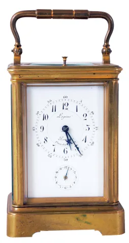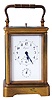 Lepine, a Paris, grand sonnerie striking carriage clock, gilt Corniche case with beveled glasses, Arabic numeral white enamel dial with subsidiary alarm chapter, blued steel hands, 8 day time and strike movement with lever platform, sounding the hour and
