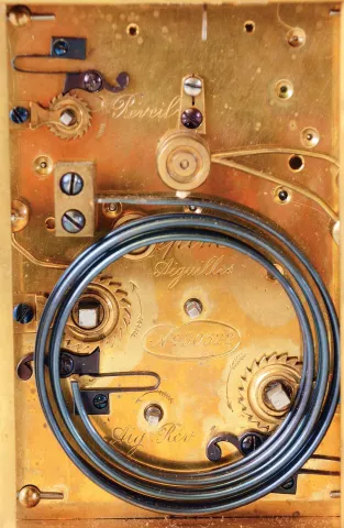 Lepine, a Paris, grand sonnerie striking carriage clock, gilt Corniche case with beveled glasses, Arabic numeral white enamel dial with subsidiary alarm chapter, blued steel hands, 8 day time and strike movement with lever platform, sounding the hour and quarters in passing, and repeating on demand, with lever for selecting grand sonnerie, petit sonnerie, and silence, dial and movement signed, serial #30522 case with most of the gilding worn away, minor tarnish and discoloration, minor verdigris, dial very good, hands replaced, movement running, strike, repeat, and alarm functions working