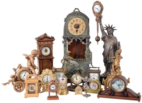 Clocks- 16 (Sixteen) Novelty: assortment of vintage and modern, cast metal and wood, all mechanical except for Horolovar miniature anniversary quartz. Other makers include Waterbury, Junghans, Roskopf, New Haven, etc. The Statue of Liberty swinger has a Junghans-type clock. 20th century these clocks overall are in good original condition, with several running, but are sold as is with no further details available. Ht of Statue of Liberty figural, with arm, 18 in