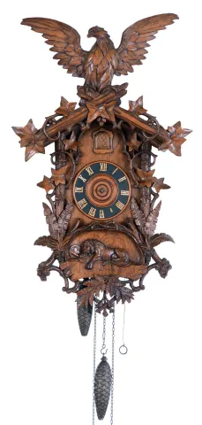 German 30 hours, carved walnut cuckoo clock, "Lion of Lucerne" motif commemorating the 1792 massacre of Swiss guards during the French revolution