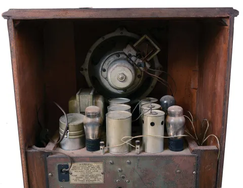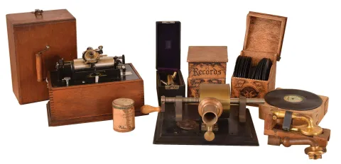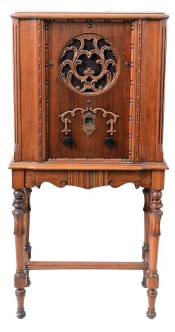 Music & Sound Producing Items- (3) and accessories: (1) Sparks, Whittington Co., Jackson, MI. "Jewel" Model 400 small size floor standing radio in Mahogany case; (2) Reproduction of the original Edison Reproducer; (3) Small portable Edison phonograph