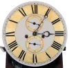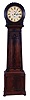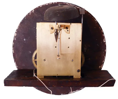 the case has a very old finish. The decorative elements at the bottom of the trunk door and several at the top of the hood door are absent and the trunk door has no key. The pendulum is period, but the weights are replacements.