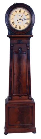 Unsigned Scottish drum top tall clock, 8 days, time and bell strike, weight driven movement in a mahogany and mahogany veneer case with painted iron dial.