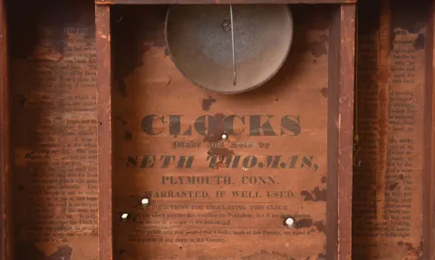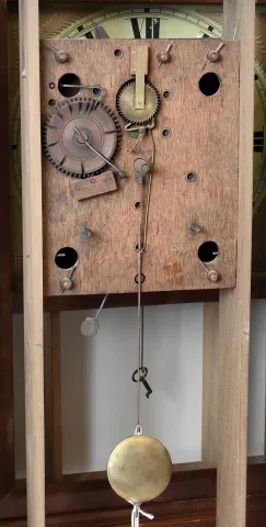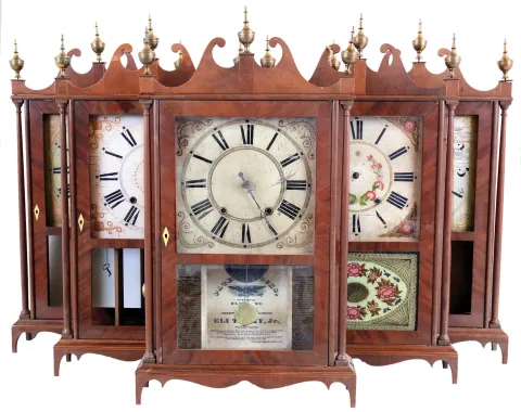 Clocks- 7 (Seven) pillar and scroll style: 6 (Six) reproductions finished hardwood cases with old 30 hour wooden movements and period dials and one period Seth Thomas the cases, not all complete, are very well made and correct, and each is fitted with what appear to be period movements and old painted wood dials. These can be completed and enjoyed, or used for parts. Five have three brass finials, but no weights. Hts to finial tops 32". The period Seth Thomas has a new bottom and a piece missing from the tablet.