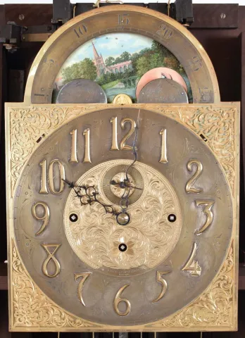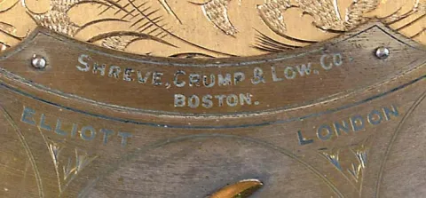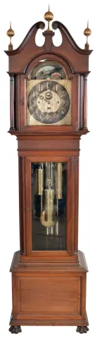 John J. Elliott, London, England for Schreve, Crump & Low Co., Boston, Mass., tall clock, 8 day, time, strike and Westminster chime on 5 signed Harrington tubes, three train brass weight driven movement in a mahogany case with full columns flanking broken arch hood with gilded wooden ball and spire finials, beveled glass in trunk door and front paw feet. The brass dial has pierced brass corner spandrels and dial center, silvered chapter ring with applied brass numerals, hour strike / silent and Westminster / silent selectors and moon phase dial the case retains its original finish. The feet and lower moldings on base are present but not attached and the tube hangers will need to be restrung. The silvered chapter ring is tarnished. Two of the hammers need to be refastened. The repair label indicates service by Philip D'avanza in January of 2012. This clock will present very well with a few minor repairs.