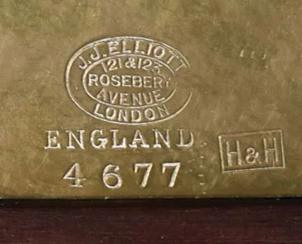 John J. Elliott, London, England for Schreve, Crump & Low Co., Boston, Mass., tall clock, 8 day, time, strike and Westminster chime on 5 signed Harrington tubes, three train brass weight driven movement in a mahogany case with full columns flanking broken