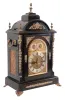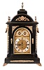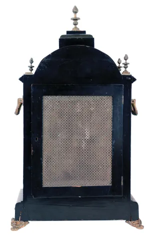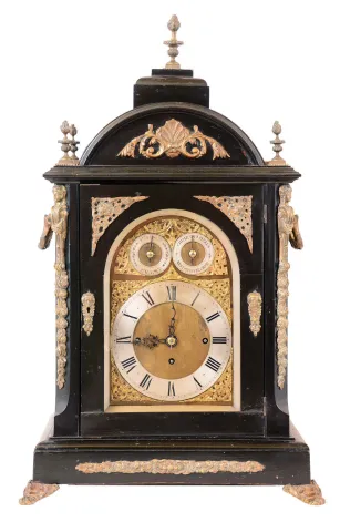 Unsigned, England, large bracket clock, ebonized case with caryatid corners, cast ornaments and feet, the sides with cast, pierced fabric backed frets below foliate ornamented carrying handles, and the top with five finials, composite dial with silvered