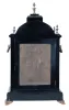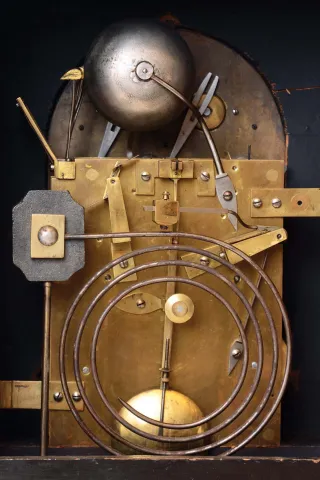 case dirty, with nicks and dings, finish with loss in arch, domed top with splits and lifting veneer, all mounts dirty, tarnished, with polish residue, and without gilding, one finial missing, top finial with broken mounting screw, upper right door joint loose, upper door hinge broken, feet loose, rear left foot moved a bit from its original location, dial trim loose, dial with minor scratches and darkening, tip of minute hand missing, movement dirty, ticks, chimes, and strikes, gong with rust