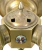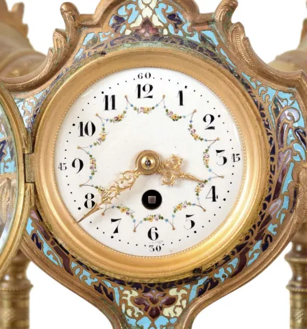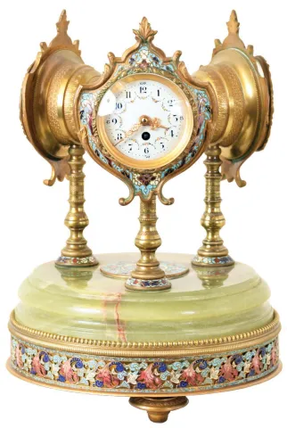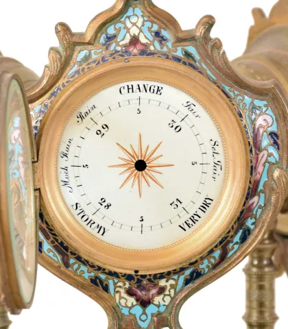 France, desk or table clock with weather station, the round, molded, green onyx base on ornamental gilt feet, and with wide, champleve enamel trim, and central champleve plaque, supporting three ornamental, turned columns surmounted by decorative cases with champleve enamel shields, one containing an 8 day timepiece with Arabic numeral white enamel dial and gilt, Louis XV hands, the second with centigrade and fahrenheit thermometers on a white enamel dial, and the last with barometer, also with white enamel dial gilding worn, dusty and with a bit of verdigris, case otherwise very good, all dials good, clock running, one screw attaching clock and barometer bezels to case broken, thermometers working, barometer missing hand