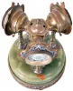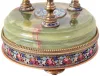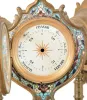 France, desk or table clock with weather station, the round, molded, green onyx base on ornamental gilt feet, and with wide, champleve enamel trim, and central champleve plaque, supporting three ornamental, turned columns surmounted by decorative cases