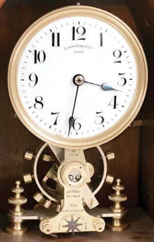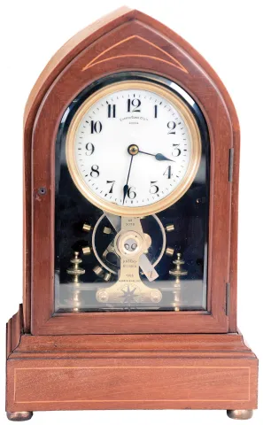 Eureka Clock Co. Ltd., London, England, battery powered mantel clock with oversized balance wheel movement in an inlayed mahogany case with beveled glasses and cream porcelain dial, s#9078