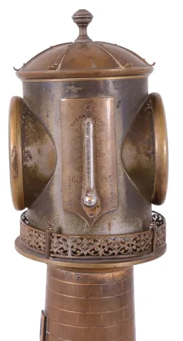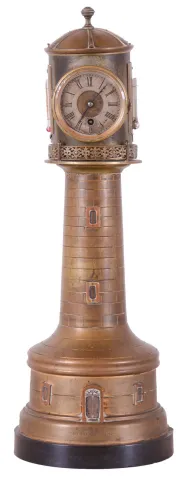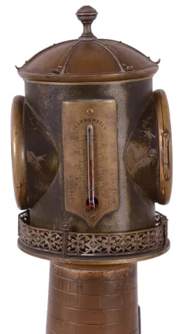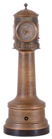 France, industrial series Lighthouse clock, the case of lighthouse form with revolving turret controlled by a movement concealed in the base, turret with railing surround and containing an 8 day timepiece, barometer, and also with farenheit and centigrade