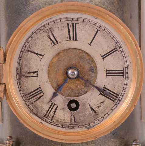 case with tarnish and polish residue, slate base with minor chips, turret very dirty, dials with darkening, thermometers intact, turret movement runs, connecting rod replaced, turret sits at a slight angle, a proper rod would solve the problem, timepiece running
