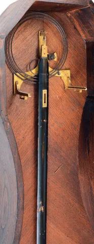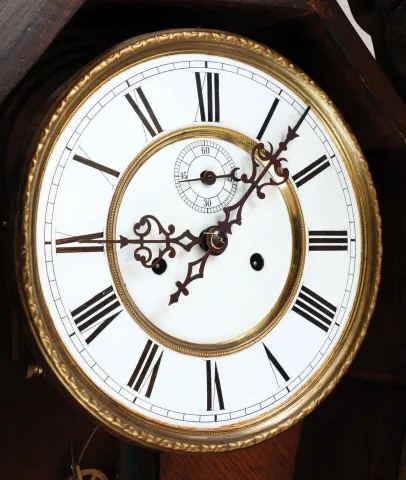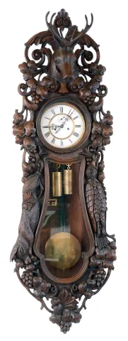 Vienna regulator wall clock, 8 day, time and strike, weight driven movement in an bench made carved case surmounted by deer head, movement circa 1870, case 20th century there is an age split in the bezel surrounding dial below 6. The dial enamel dial has a sunken center, second's bit and embossed dial surround. The movement is unmarked other than a serial number.